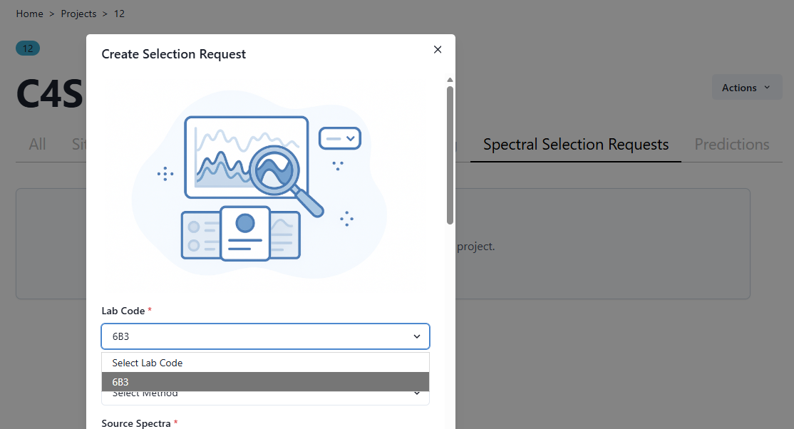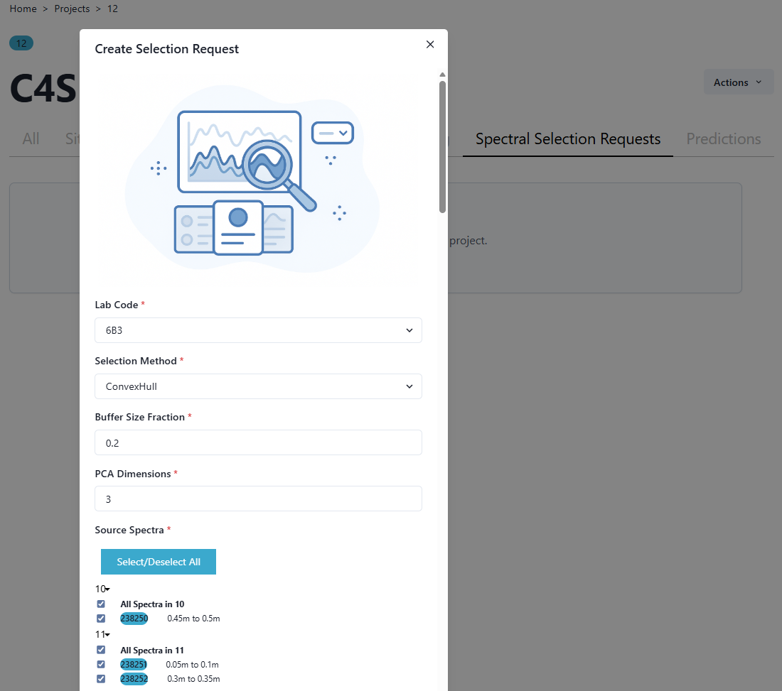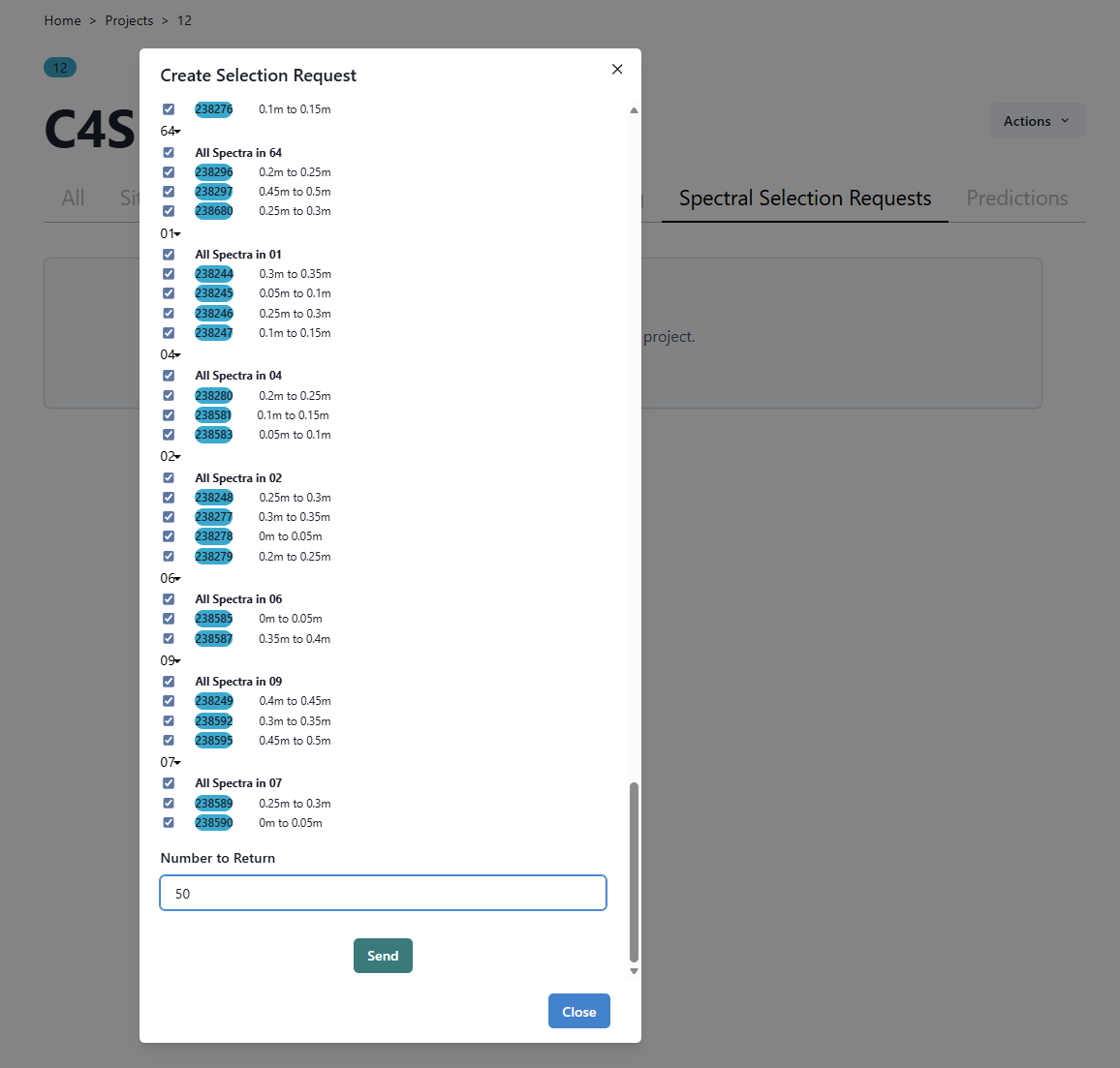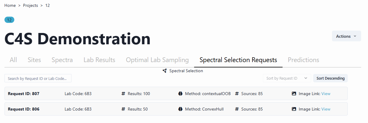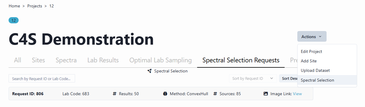 Once this selection request has been processed in C4S, results are available in the Project menu. Navigate to the All page and then back to the Spectral Selection Request page and your request will appear.