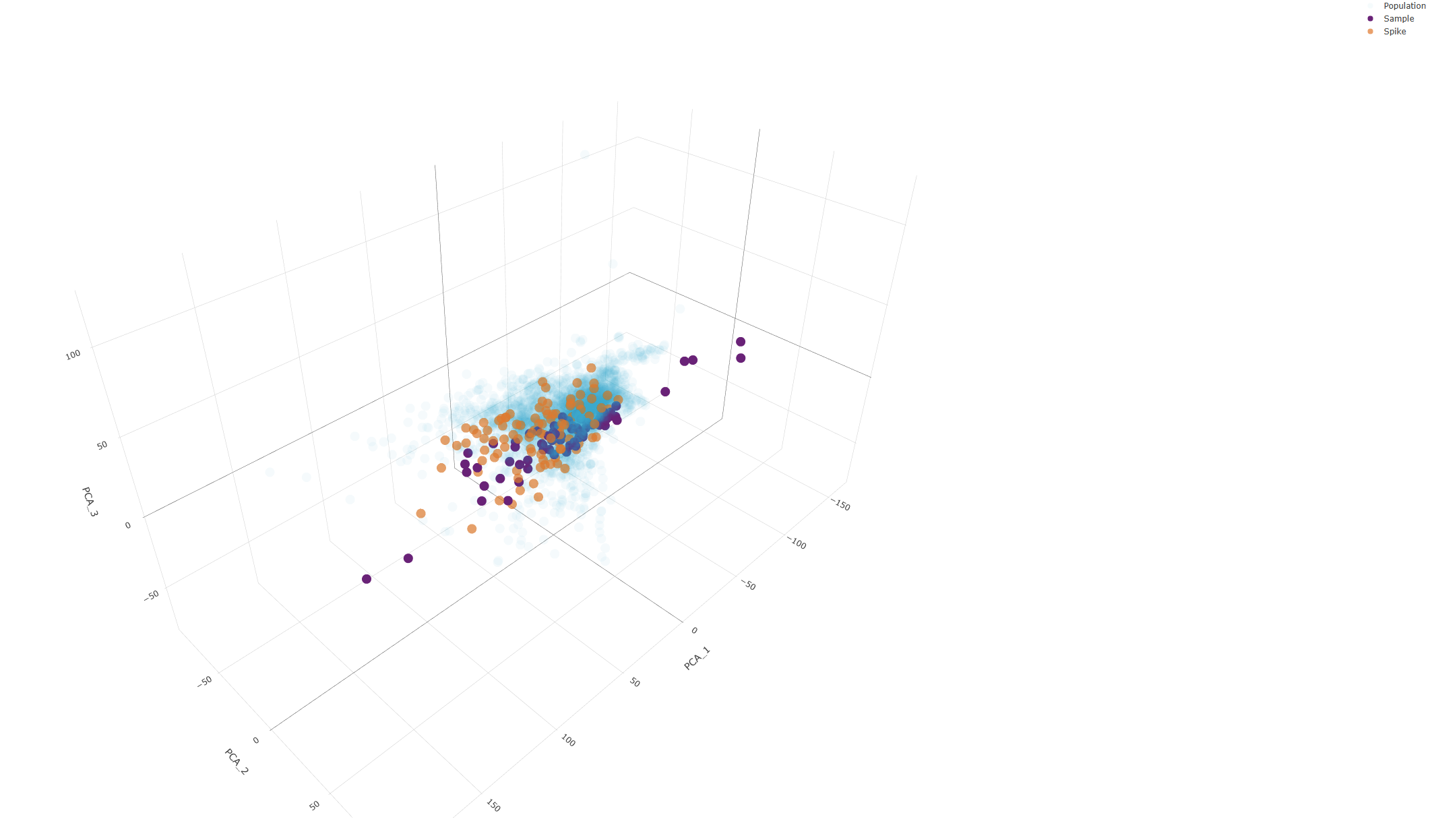 In the plot below, the user can examine the 3 PCA Dimensions, and how the uploaded Local spectral library dataset (purple) fits within the population of the Australian national soil spectral library (light blue). The user can also see the selection request, which corresponds to the datapoints seen in orange. In the example below the local library is represented relatively well within the population of the national library. From the plot below, we can see that the contextualOOB selection method results in a more representative spectral selection from the national library to complement the local library.