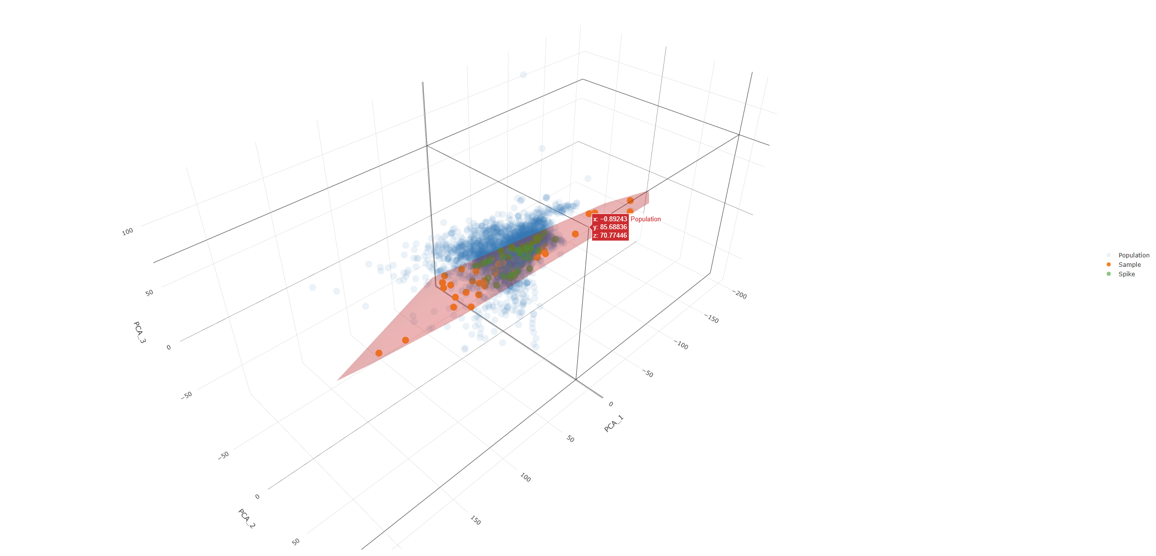 Navigating to the ‘Image Link: View’ field corresponding to the Method request, opens up another window that shows the selection request through a graphical representation. In the plot below, the user can examine the 3 PCA Dimensions, and how the uploaded Local spectral library dataset (orange) fits within the population of the Australian national soil spectral library (blue). The user can also see the selection request, which corresponds to the datapoints seen in green. In the example below the local library is represented relatively well within the population of the national library.