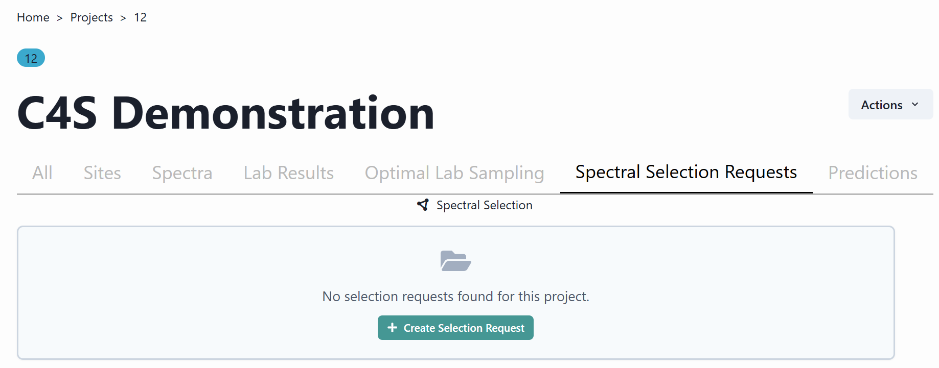 To perform another selection request, navigate to the Actions tab and select Spectral Selection from the dropdown Menu.