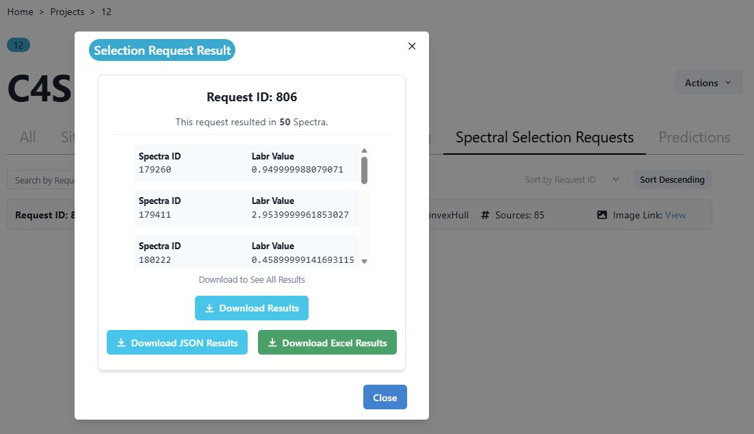 Follow the steps as outlined above to complete this selection request. The results will then appear under the Spectral Selection Requests page.